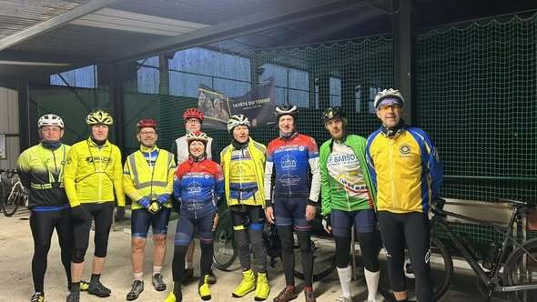 Arrivé sur place vers 6h30 prise d’inscription pour certains ou paiement de la participation pour d’autres, un café est proposé. Préparation du vélo, sacoche et tenue vestimentaire en conséquence (ambiance humide, brouillard et frais). Départ en principe à 7h00 photos, lorsqu’un participant arrive… donc départ retardé d’une dizaine de minutes.