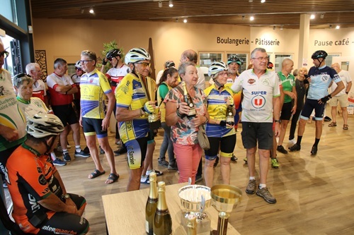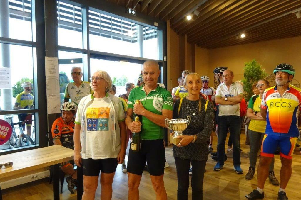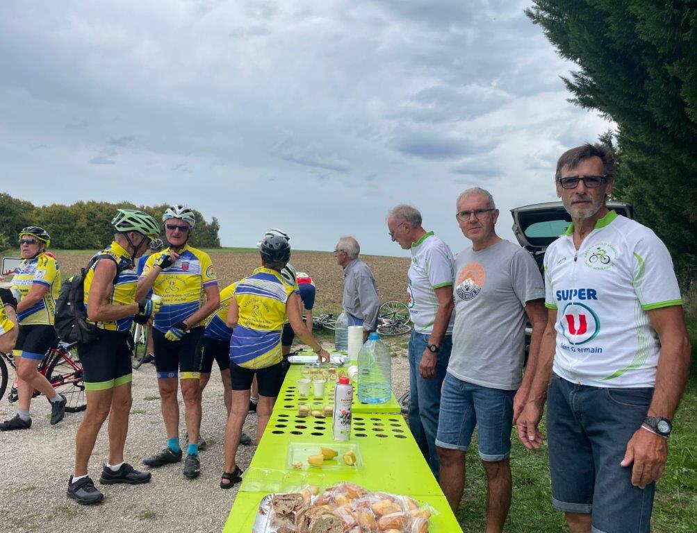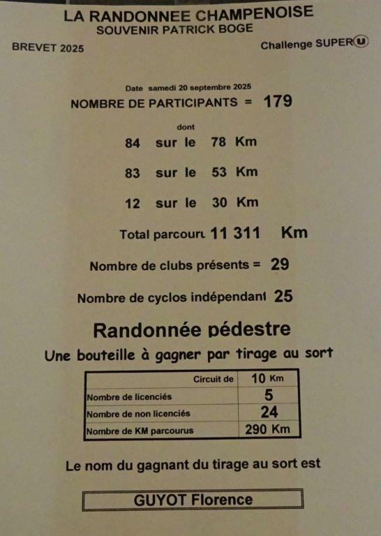 Samedi 20 septembre, l’AC Germinoise invitait les cyclos à la randonnée Champenoise « Souvenir Patrick Bogé » sur 3 parcours. Malgré un temps un peu nuageux, de la chance car pas de pluie lors de cette organisation qui a réuni 173 participants. 39 VCS présents (41,94%) : 13 sur le 78km dont une féminine : Anne, 21 sur le 53km dont 7 féminines : Mireille, Jacqueline, Nadine, Claudie, Pascale, Carole et Catherine, 5 sur le 30km dont 2 féminines : Françoise et Michèle. Le VCS remporte le Challenge et 2 bouteilles pour le club le plus représenté devant le VC Bréviandes avec 18 présents et à la 3ème place l’AS Barberey avec 15. Comme à chaque fois belle organisation de l’AC Germinoise avec leur belle équipe de bénévoles, que nous remercions très sincèrement. Merci à nos sociétaires qui étaient disponibles pour se rendre à Saint-Germain, pour participer à ce Souvenir Patrick Bogé. Bravo à toutes et à tous. Ps : présence aussi de Liliane à la marche, qui reprend un peu l'activité sportive, après sa chute à la semaine fédérale.